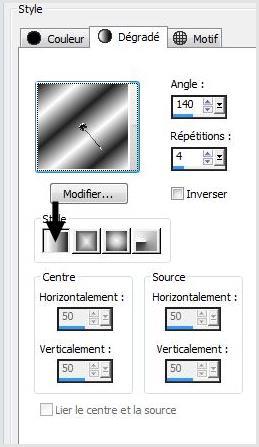 2 - Placer en premier-plan la couleur #202020 et en arrière-plan la couleur #ffffff Dans la Palette de Style Configurer un dégradé linéaire angle: 140/Répétitions : 4
