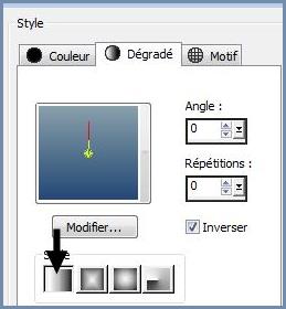 2 - Placer en premier-plan la couleur #879faa et en arrière-plan la couleur #234875 Dans la Palette de Style Configurer un dégradé linéaire angle: 0°/Répétition : 0 /Inverser non coché