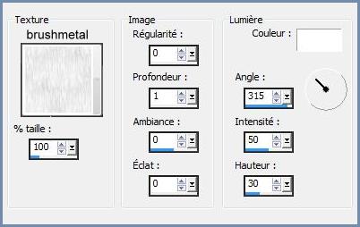 ** Réglages/Flou/Flou gaussien : rayon : 8 **Effets /Effets de Textures/Texture brushmetal réglages précédents Sélection/Ne rien sélectionner
