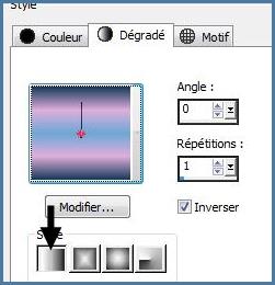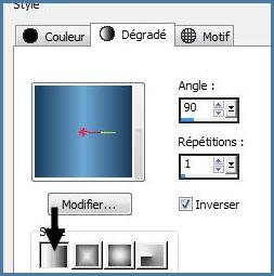 2 - Placer en premier-plan la couleur #6da7d5 et en arrière-plan la couleur #193a5b Dans la Palette de Style Configurer un dégradé linéaire angle: 90°/Répétition : 1/ inverser coché