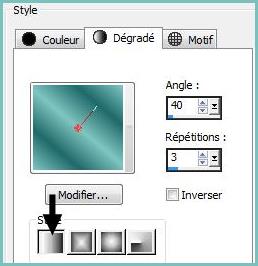 2 - Placer en premier-plan la couleur #7ec4c0 et en arrière-plan la couleur #20696a Dans la Palette de Style Configurer un dégradé linéaire angle: 45°/Répétitions : 3