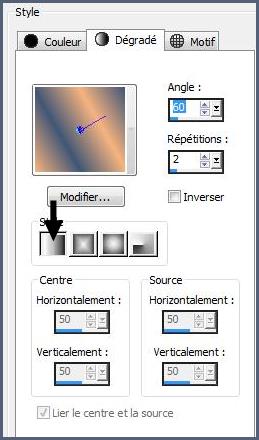2 - Placer en premier-plan la couleur #f4b27f et en arrière-plan la couleur #415676 Dans la Palette de Style Configurer un dégradé linéaire angle: 60°/Répétitions : 2