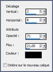 Sélection/Ne rien sélectionner ** Effets/Effets 3D/Ombre Portée : 2/8/71/21/couleur #000000