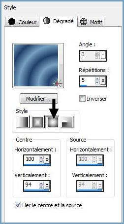 2 - Placer en premier-plan la couleur #75a0bf et en arrière-plan la couleur #213e6b Dans la Palette de Style Configurer un dégradé halo /Répétitions : 5 Centre hor.: 100/ vert.: 94