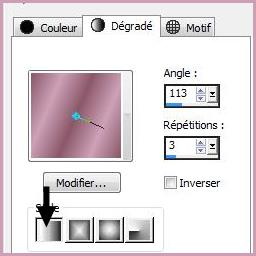 2 - Placer en premier-plan la couleur #8b5869 et en arrière-plan la couleur #cda1b8 Dans la Palette de Style Configurer un dégradé linéaire, angle : 113/Répétitions : 3