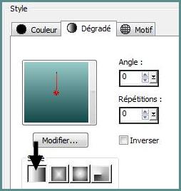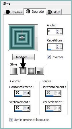2 - Placer en premier-plan la couleur #164949 et en arrière-plan la couleur #98caca Dans la Palette de Style Configurer un dégradé rectangulaire/angle: 0°/répétitions : 5/case inverser cochée