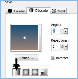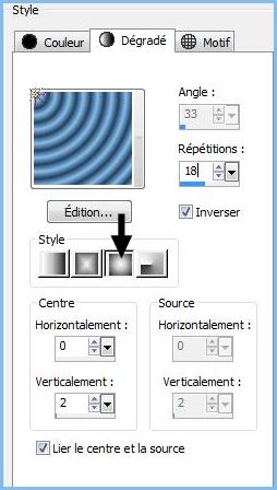 2 - Placer en premier-plan la couleur #84bdec et en arrière-plan la couleur #25405e Dans la Palette de Style Configurer un dégradé halo /Répétitions : 18/inverser coché centre Hor. = 0/Vert. = 2