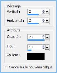 9 - Activer le calque 1 ** Effets/Effets 3D/Ombre Portée : 2/2/78/18/couleur #000000