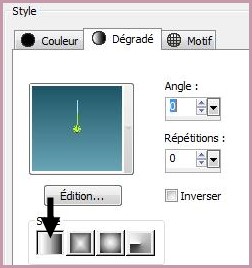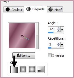 2 - Placer en premier-plan la couleur #c598aa et en arrière-plan la couleur #7a4258 Dans la Palette de Style Configurer un dégradé linéaire/ angle: 120/Répétitions : 3