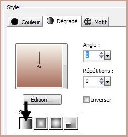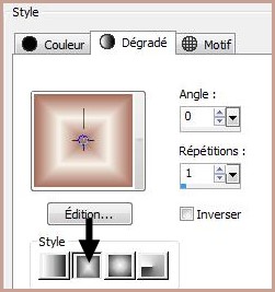 2 - Placer en premier-plan la couleur #a66b59 et en arrière-plan la couleur #f8f4eb Dans la Palette de Style Configurer un dégradé rectangulaire/ angle: 0/Répétition : 1
