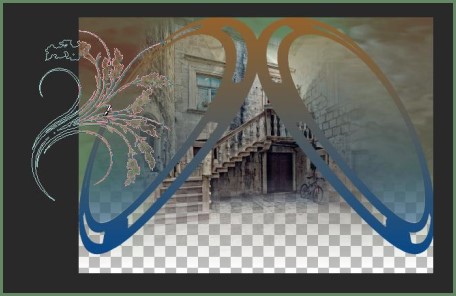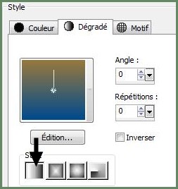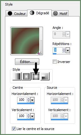 2 - Placer en premier-plan la couleur #628c66 et en arrière-plan la couleur #603c2e Dans la Palette de Style Configurer un dégradé halo/ Répétitions : 3