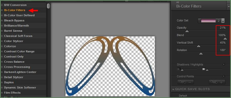 10 - Effets/ Color Efex Pro 3.0/ Bi-colore filters réglages suivants :