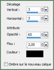 16 - Activer le calque supérieur Effets/Effets 3D/Ombre Portée : 3/3/65/25/couleur #000000
