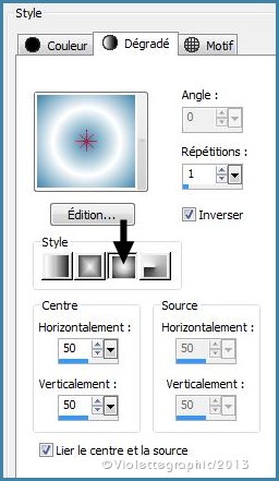 ***Dans la Palette de Style Configurer un dégradé halo/Répétition: 1/ Centre Hor.=0/ Centre vert.=0