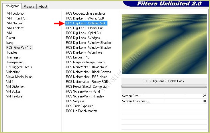 3 - Effets/Unlimited/RCS Filter pak 1.0/ RCS Digi-Lens -Bubble Pack réglages suivants :