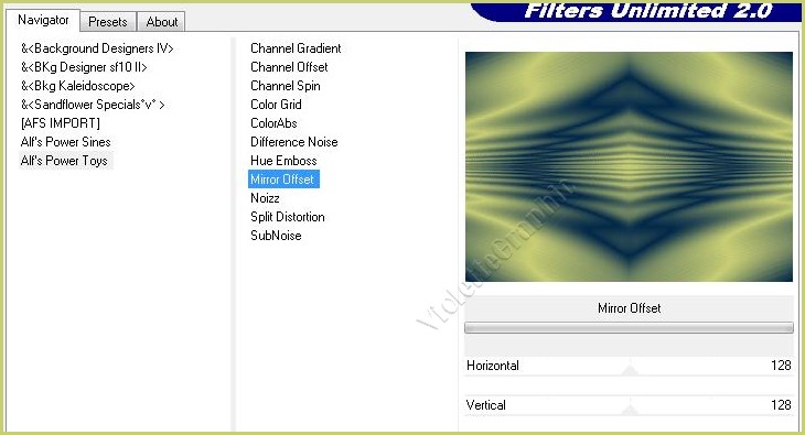 4 - Effets/Effets de bords/Accentuer 5 - Effets/Unlimited/Alf's Power Toys/ Mirror Offset réglages suivants :