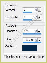 13 - Effets/Effets 3D/Ombre Portée : 0/0/100/100/couleur #012849