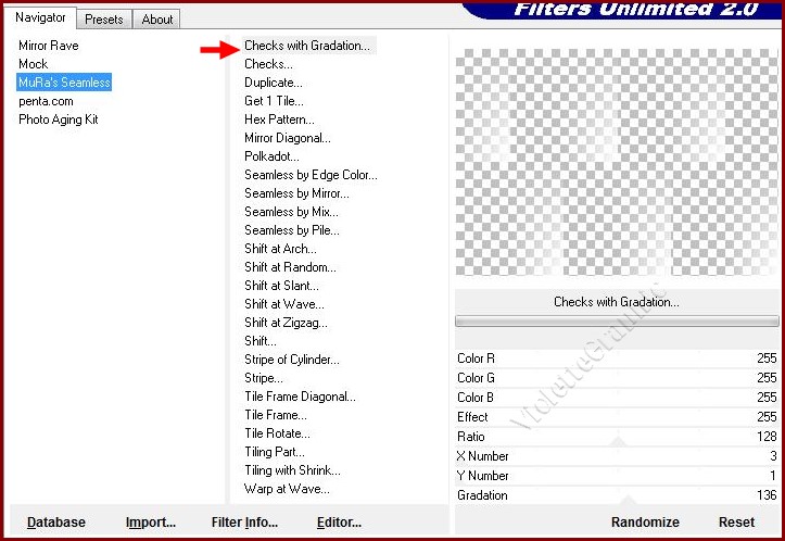 5 - Calques/Nouveau calque Effets/MuRa's Seamless /Checks with Gradation réglages suivants :