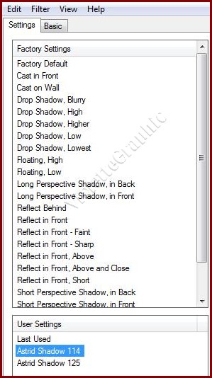 Karine Placez votre masque dans le dossier masques de My PSP File Placez vos sélections dans le dossier sélections de My PSP File **Placez le préréglage " Astrid Shadow 114" dans le dossier du plugin Alien Skin EyeCandy5 Impact-Perspective Shadow