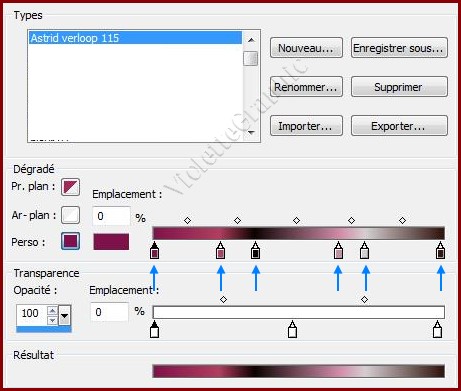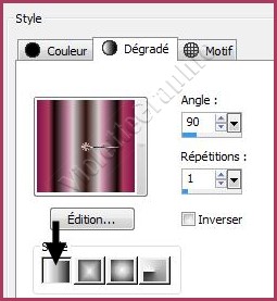 *** 1 - Dans la Palette de Style Placer le dégradé Astrid verloop 115.PspGradient en avant-plan et la couleur blanche en arrière-plan