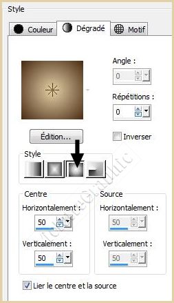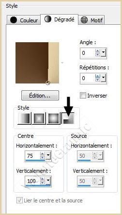 ***Dans la Palette de Style Configurer un dégradé radial/angle : 0//Répétition: 0 Centre Hor.= 75/ vert. = 100