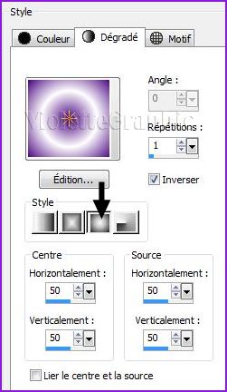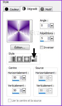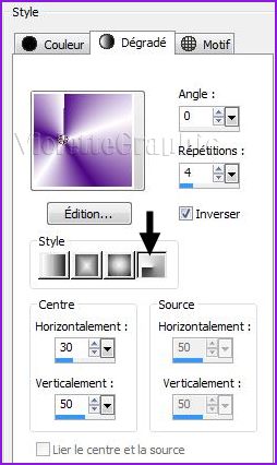 7 - Installer le dégradé formé des couleurs :configuré : radial/angle: 0°/Répétitions: 4 / inverser coché Centre Hor.= 30/ Vert.= 50