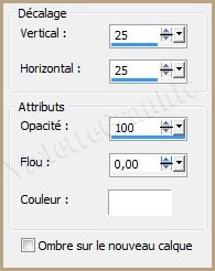 10 - Effets/Effets 3D/Ombre Portée : 25/25/100/0/couleur #ffffff