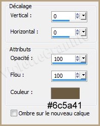 28 - Effets/Effets 3D/Ombre Portée : 0/0/100/100/couleur #6c5a41