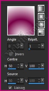 1 - Ouvrir une image transparente de 750 x 500 pixels Remplir de dégradé configuré : halo/angle: 0°/Répétition: 1/inverser non coché Centre: hor.=50/ vert.=100
