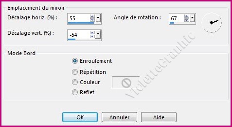 9 - Effets/Effet de Distorsion/Cintrage réglages suivants : intensité à 100% 10 - Effets/Effets de réflexion/Miroir Rotatif réglages suivants :