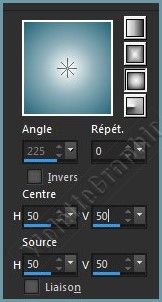 1 - Ouvrir une image transparente de 800 x 550 pixels Remplir de dégradé halo : Répétition: 0/inverser non coché Centre: hor.= 50/ vert.= 50 Source: hor.= 50/ vert.= 50