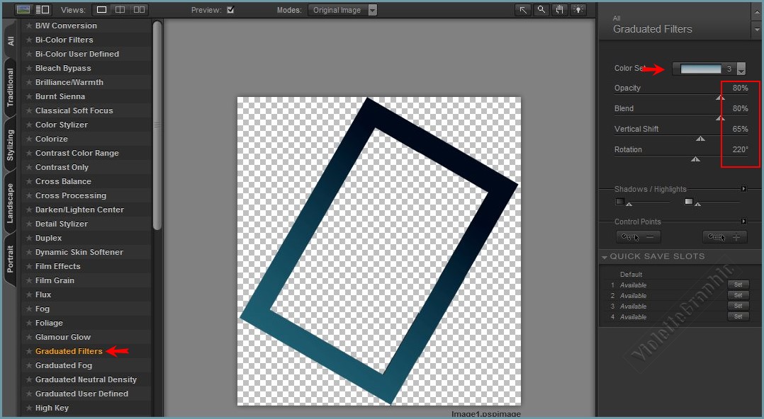27 - Effets/Nick Software /Color Effex Pro!1.0 /Graduated filter Set Color Blue n°/ 80/80/65/220