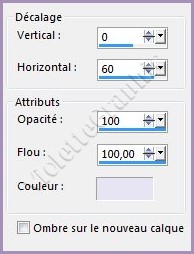 14 - Effets/Effets 3D/Ombre Portée : 0/60/100/100/couleur #e7e5f3