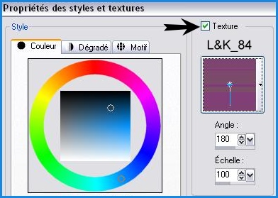39 - Calques/Fusionner les calques visibles Maintenant nous allons faire le fond 40 - Ouvrir votre avant-plan 41 - Calques/Nouveau calque 42 - Remplir de couleur foncée 43 - Placer en avant-plan une couleur plus claire dans les mêmes tons 44 - clic dans votre carré de couleur et rechercher la texture L&K_84