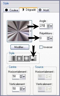 *** PREPARATION: Placer en avant-plan le gradient avec ces réglages : radial/ angle : 270/ répétition: 0 ( ceci dépend du choix de vos couleurs )