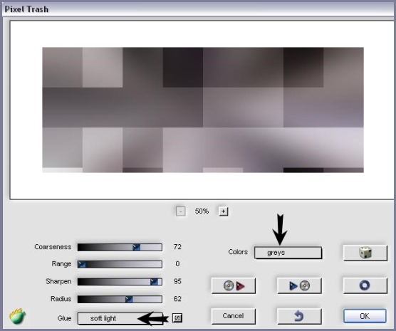 Image : 9 - Ouvrir une image transparente de 410 x 290 pixels 10 - Remplir avec le gradient 11 - Réglages/Flou/Flou gaussien : rayon : entre 50/60 12 - Répéter l'effet Filtre Flaming Pear/Pixel Trash 13 - Répéter l'effet Xero/Tekstya mais avec ces réglages:
