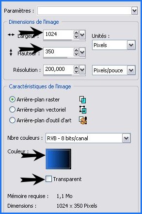 1 - Ouvrir une image de 1024 x 350 pixels 2 - le dégradé en fond coeur 3 - Case transparent décoché