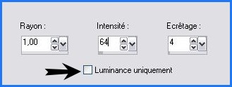 12 - Effets/FM Tile Tools /Blend Emboss par défaut Le Tube 13 - Activer votre tube ou celui fourni ( je l'ai placé en mode Luminance héritée) 14 - Image/Redimensionner à 280 pixels de hauteur 15 - Réglages/Netteté/Masque Flou: