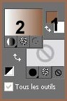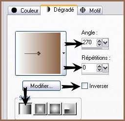 1 - Préléver deux couleurs de votre tube Placer en avant-plan une couleur foncée ( ici #906449) Placer en arrière-plan une couleur claire (ici #ffffff) 2 - Configurer un dégradé linéaire angle: 0°/Répétition: 0/Inverser coché