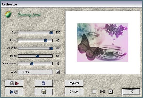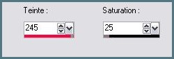 31 - Réglages/Teinte et Saturation/Coloriser ( dépend des couleurs choisies ) 32 - Sélections/Désélectionner 33 - Répéter l'effet Flou artistique 34 - Calques/Fusionner Tout 35 - Exporter en JPEG Optimisé