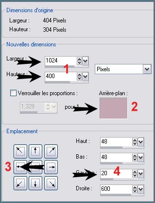21 - Image/Ajouter des bordures : 2 pixels couleur foncée de votre image 22 - Sélectionner la bordure avec la baguette magique 23 - Effets/Effets 3D/Biseautage Intérieur : Biseau métallique 24 - S élection/désélectionner tout25 - Image/Taille du Support : Dimensions : 1024 x 300 / Couleur du fond pélévée dans votre image clic sur le carré du milieu de la rangée de gauche et placer le chiffre : 20 à gauche
