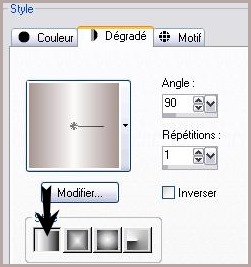 1 - Ouvrir une image transparente de 1024 x 400 pixels 2 - Placer en avant-plan la couleur #a59691 et en arrière-plan la couleur #fdfbfe 3 - Configurer un dégradé linéaire angle: 0°/Répétition: 0/Inverser coché