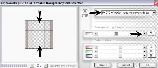31 - Répéter l'effet de réflexion/Miroir Rotatif 32 - Effets/Cybia/Alphaworks : ** PHOTO WhiteOut ** Transparency Range à 100 ** le milieu doit être transparent