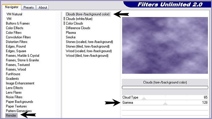 6 - Calques/Dupliquer 7 - Effets/Filtre Unlimited/Render /Clouds avec ces réglages: