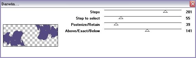 28 - Sélection/Transformer la sélection en calque Garder sélectionné 29 - Effets/ Filtre Toadies/Darwin avec ces réglages: