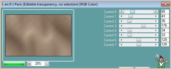 9 - Calques/Fusionner les calques visibles 10 - Couches/Dupliquer 11 - Effets/L&K/Djin avec ces réglages:
