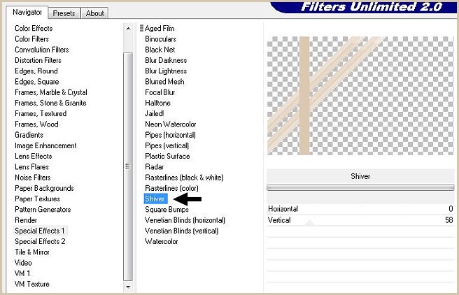 23 - Calques/NOUVEAU CALQUE 24 - Sélection/Charger/Enregistrer une sélection/charger à partir du disque/Charger la sélection Lz_Rhianwyn_02 25 - Remplir de couleur #dcc8b0 26 - Sélections/Ne rien sélectionner 27 - Effets/Unlimited/Spécial Effets 1/Shiver réglages suivants :