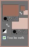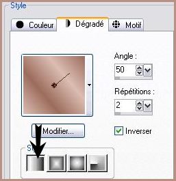 *** 1 - Ouvrir une image de 900 x 600 pixels 2 - Placer en avant-plan la couleur #9c6d5d 3 - En arrière-plan la couleur #dbbdb2 4 - Configurer un dégradé linéaire angle: 0°/Répétition: 0/Inverser coché