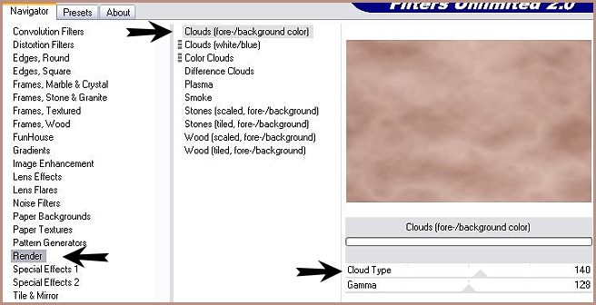 7 - Calques/Dupliquer 8 - Effets/Unlimited/Render/Clouds( Foreground-Background ) avec ces réglages