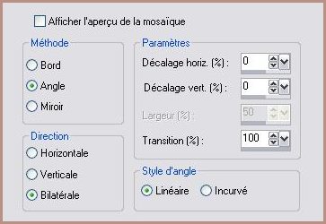 Ouvrir le tube abstract2_by_passy.pspimage Nous travaillons sur ce tube 30 - Sélection/Charger/Enregistrer une sélection/charger à partir du disque/Charger la sélection Lz_Marly 03 31 - Edition/Copier 32 - Edition/Coller comme nouvelle image 33 - Effets/Effets d'image/Mosaïque sans jointure :